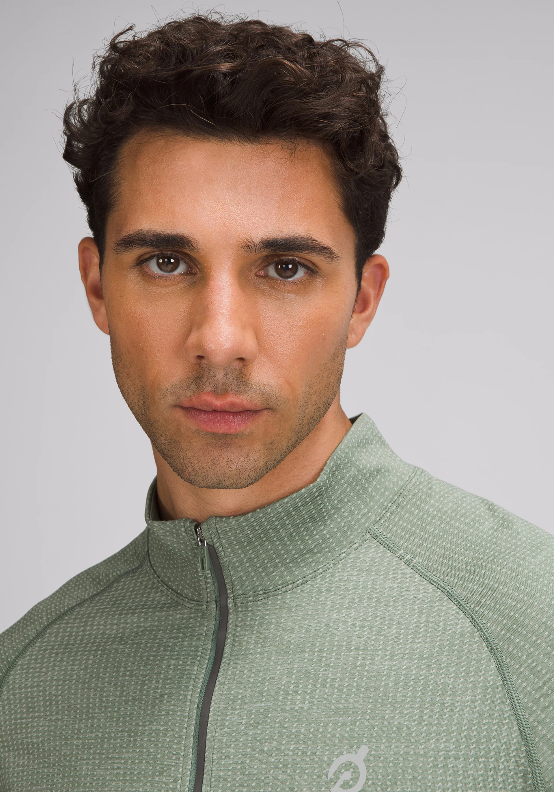 Long sleeve, half zip with zipper garage and no side seams so you can skip the chafe