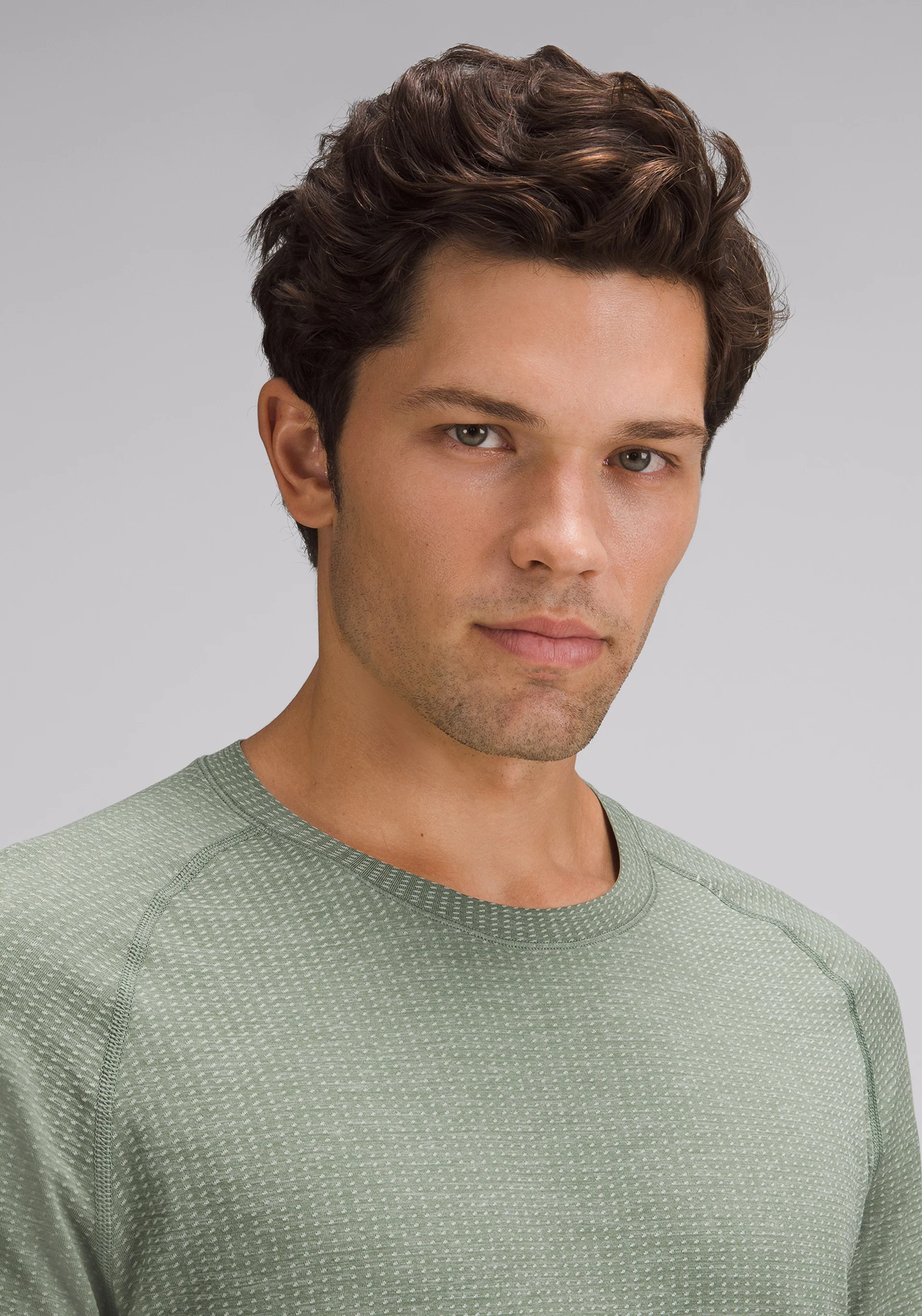 Crewneck, short sleeve with no side seams so you can skip the chafe and a rebalanced fabric and fit for less cling on sweaty skin