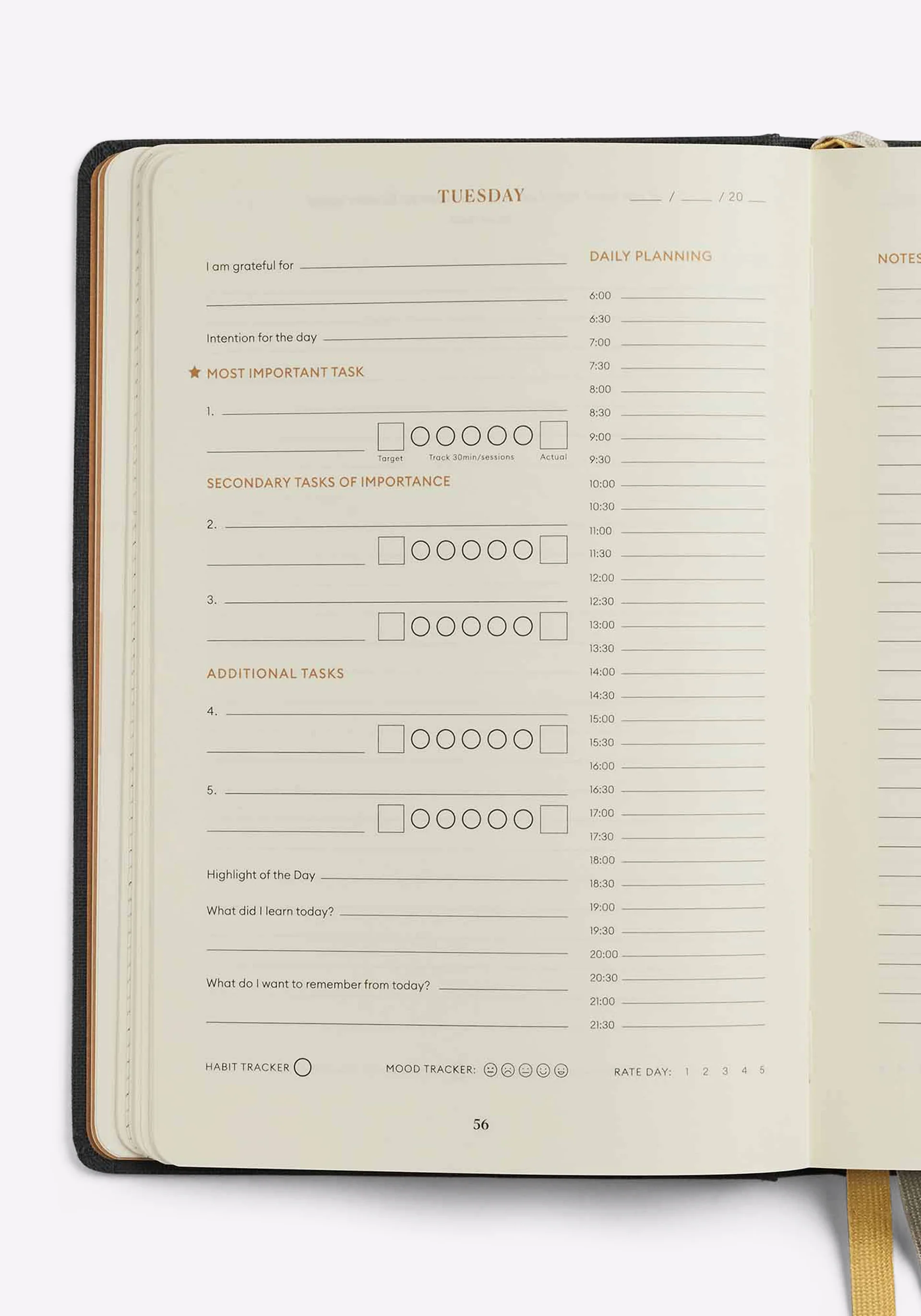With The Productivity Planner, you're equipped with well-established techniques distilled in a simple, science-backed format. By prioritizing only five tasks daily, focusing on the most critical first, and applying the Focus Time method to maintain single-task concentration, you'll breeze through projects you've been putting off.
