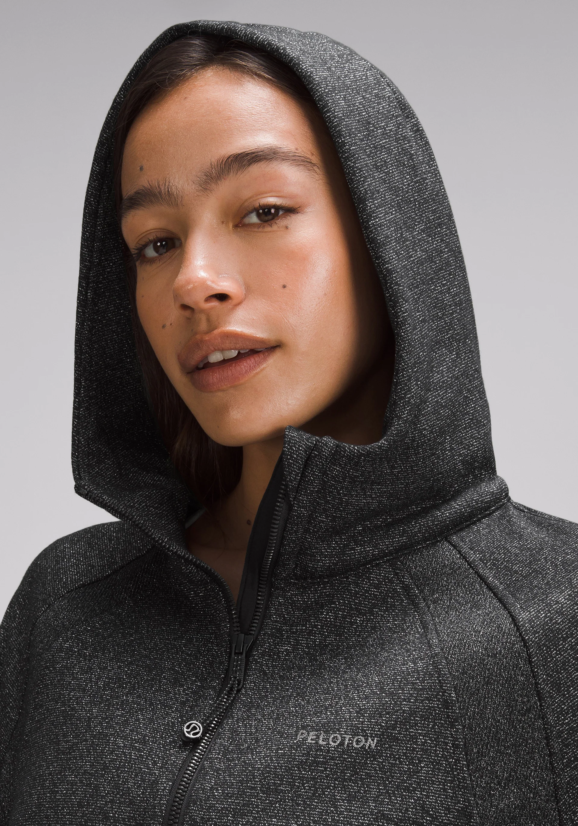 Half-zip, hooded pullover with elastic zipper pull that doubles as an emergency hair tie, kangaroo pocket with hidden phone sleeve, zipper garage, and thumbholes