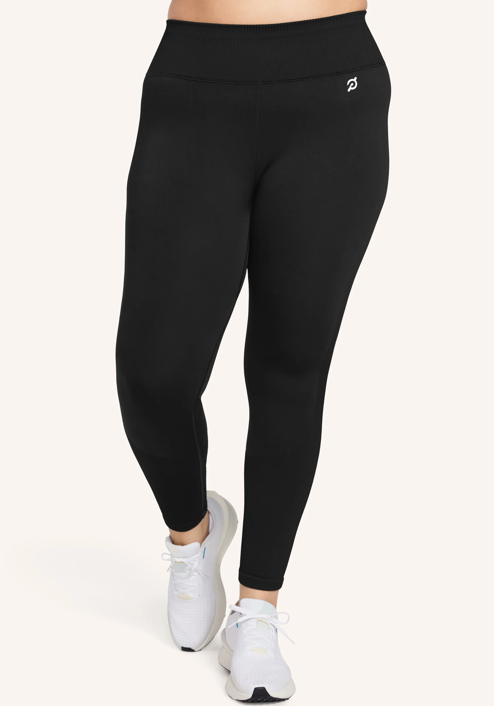 - High rise, 25” inseam legging with contour shaping at back and rib detailing at waist, side seam and lower leg
